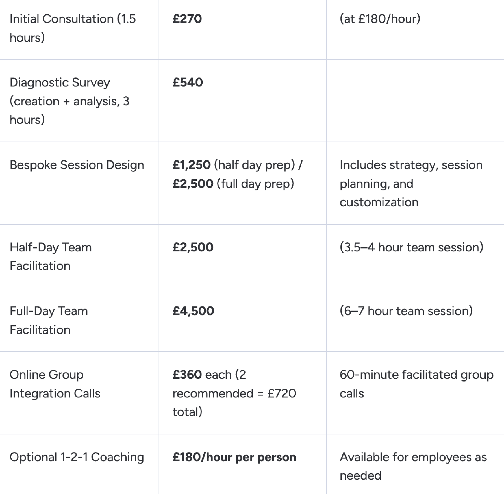 My approach offers a holistic journey: from initial consultation and systemic diagnosis to bespoke session design, experiential team facilitation, and ongoing integration support.